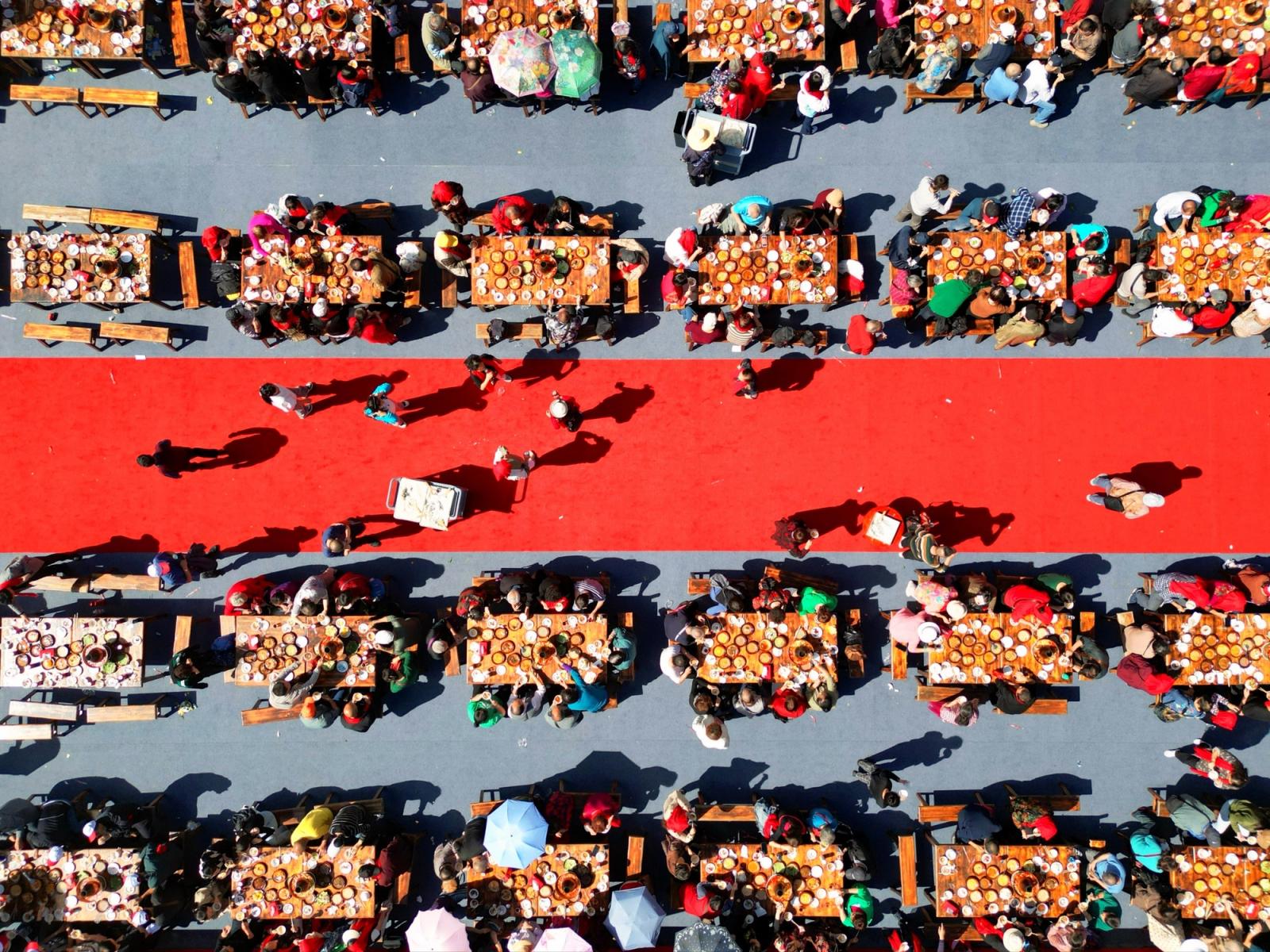 长龙宴是五峰的一项传统活动,曩昔持续只在婚典、丰充等蹙迫庆祝时期举行。每当此时,村民们会将自家的四方桌搬到户外空旷之地,一字排开,连成长达百米的宴席,宛如一条迤逦的“长龙”匍匐于山间,因此得名“长龙宴”。