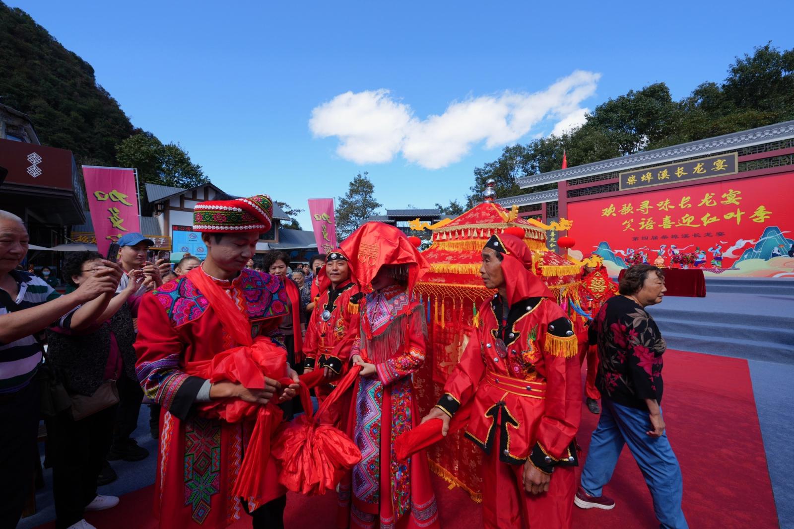 欢歌寻味长龙宴,笑语喜迎红叶季。10月18日中午,在湖北五峰土家眷自治县柴埠溪景区,跟着支客师一声清翠嘹亮的 “开席咯!”,一场别开生面的“长龙宴”伴着土家歌舞扯后腿开席。