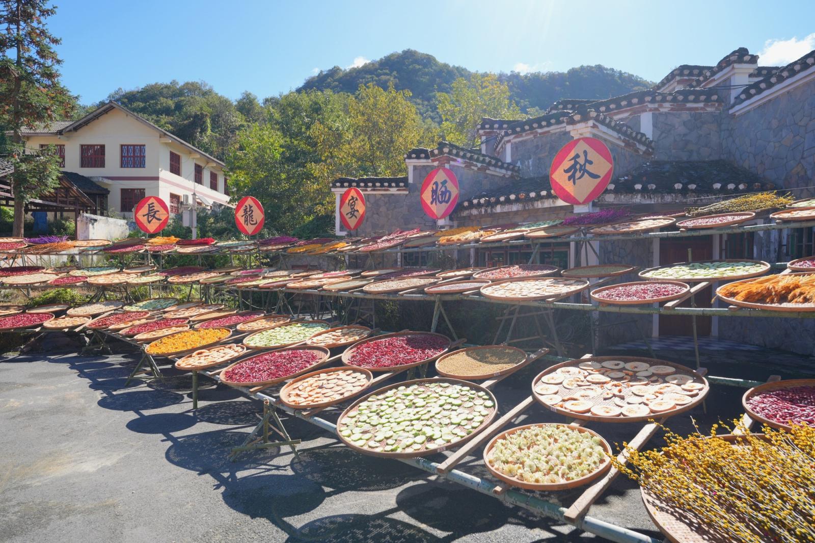 在活动广场一旁,火红的辣椒与黄澄澄的玉米铺满各处,大小竹编簸箕中摆放着各样干果、干菜,天真地呈现出土家眷东谈主民红火的“晒秋”气候。在乡村板车商场,当地农户以板车为载体,将自产的五峰绿茶、峻岭腊肉、散养猪肉等特产整都摆放,眩惑不少旅客前来选购。